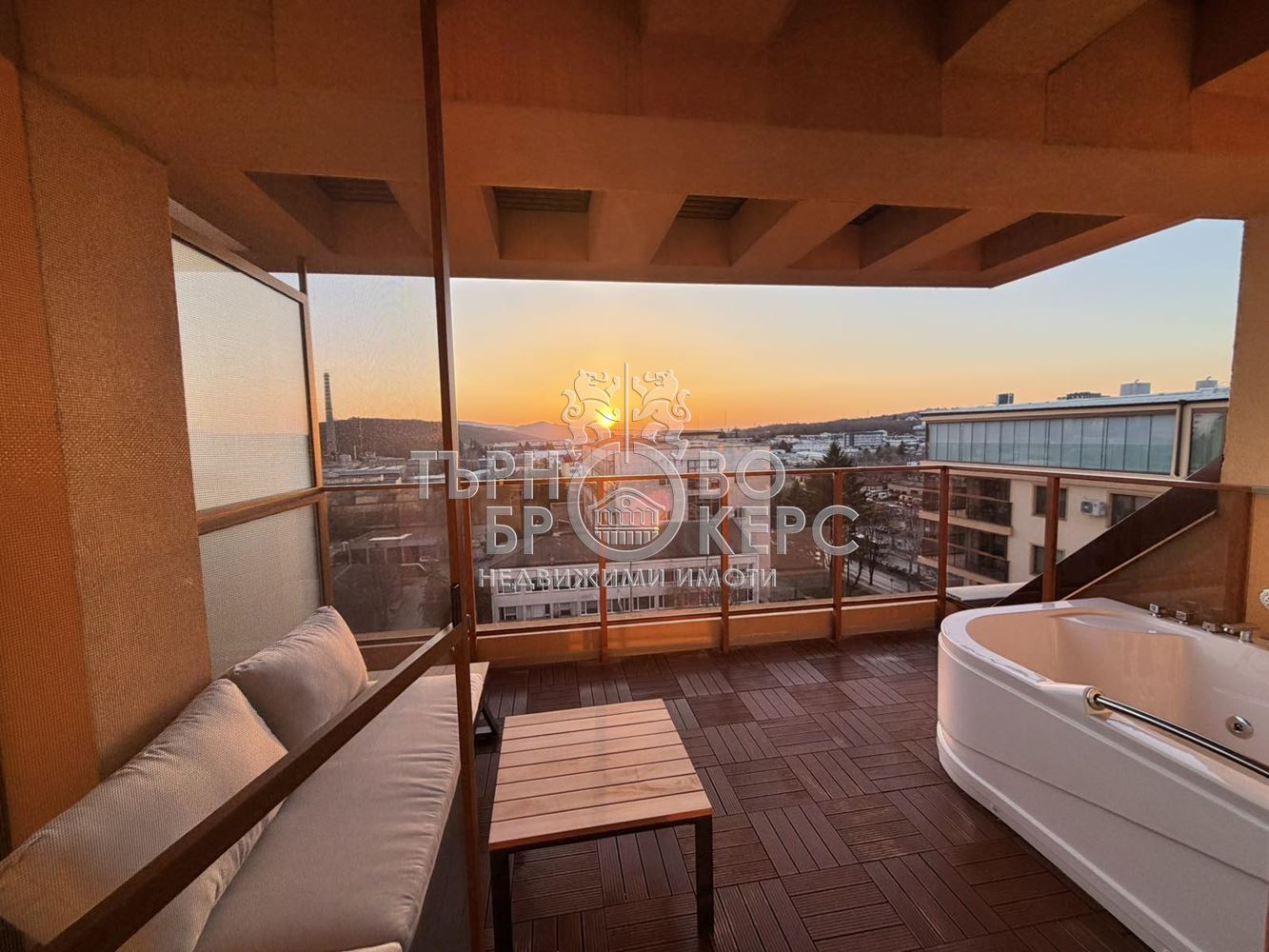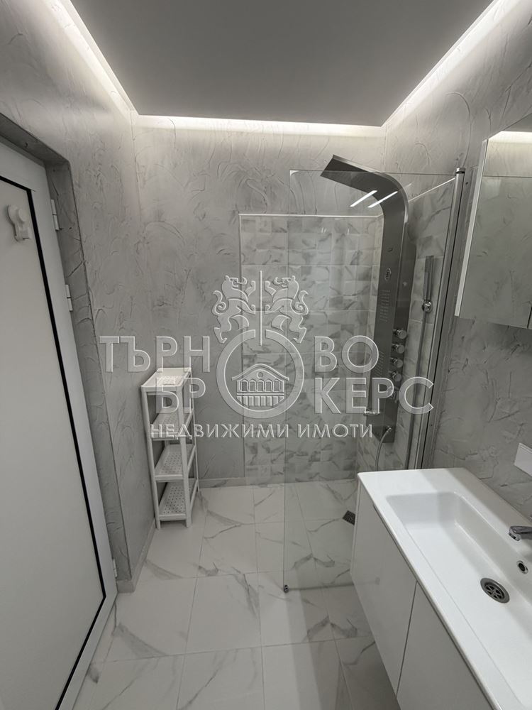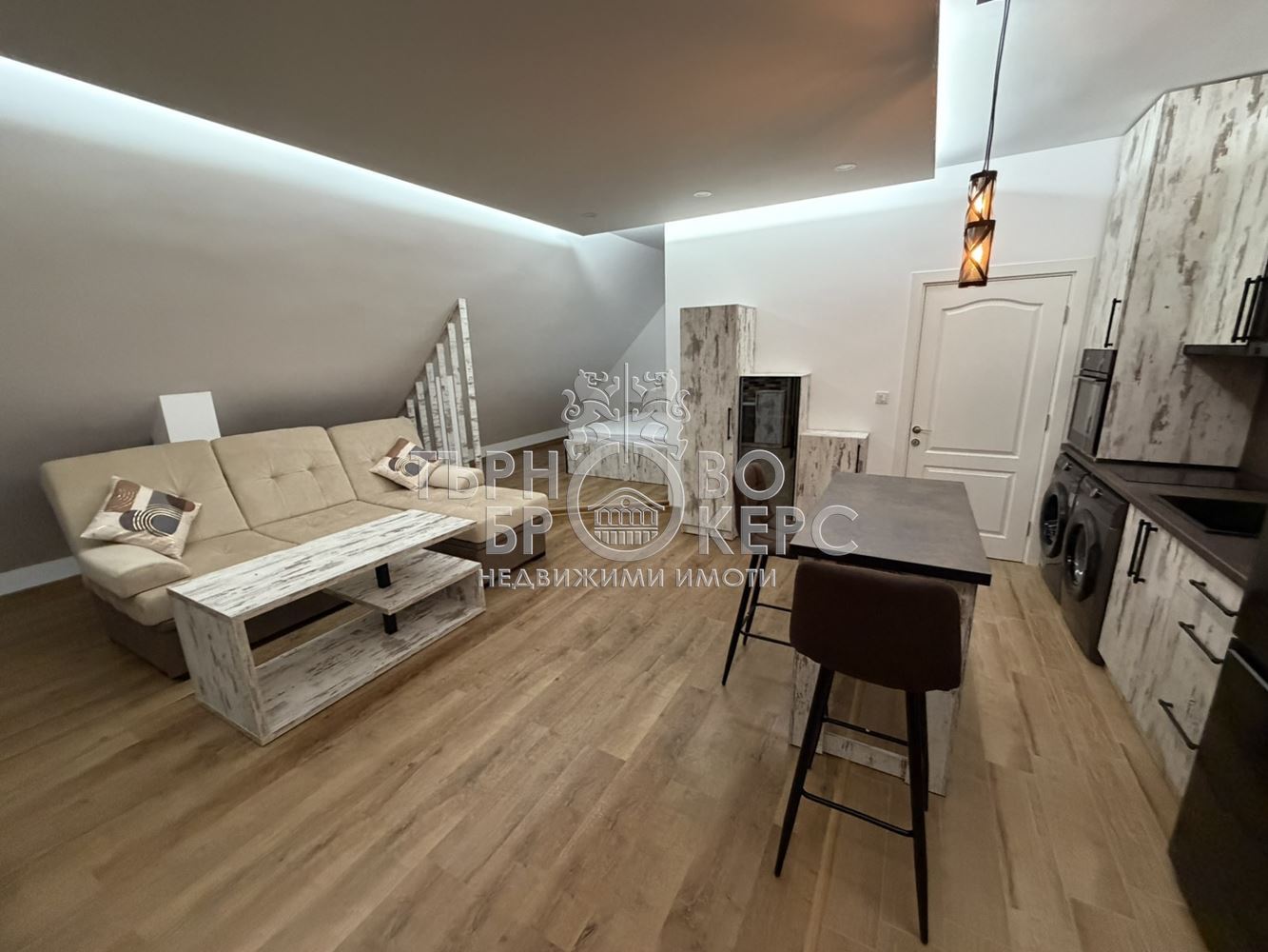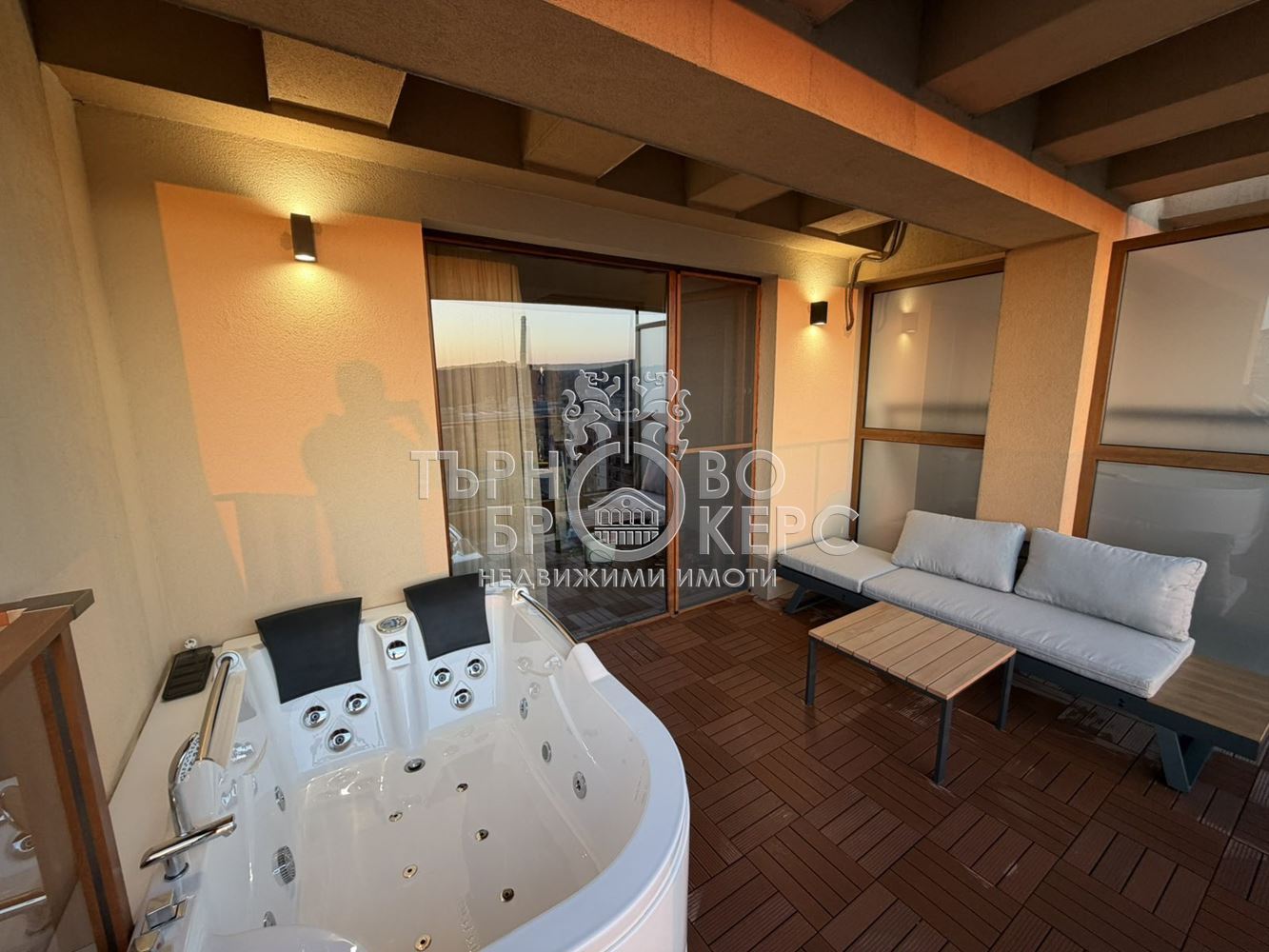 Екипът на Търново Брокерс Ви представя едностаен апартамент, находящ се в кв.Бузлуджа. Жилището е със следното разпределение: Всекидневна с кухненски бокс, отделен кът за спалня, баня и тоалетна, коридор и 14кв.м. тераса, която е покрита и разполага с хидромасажна вана с топла вода. Изцяло обзаведено и оборудвано със следните ел.уреди: вградена фурна с котлони, пералня, сушилня, хладилник, телевизор и климатик. Има възможност за наемане на надземно паркомясто.