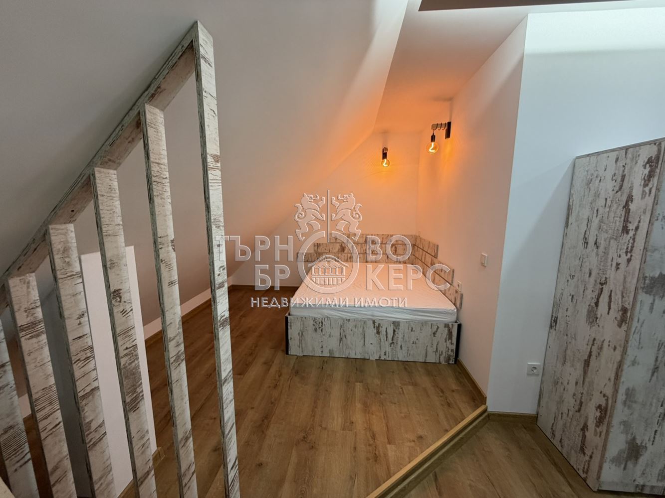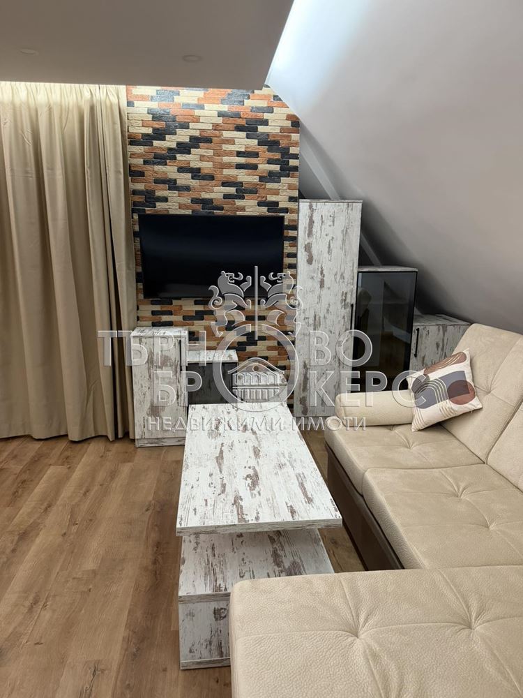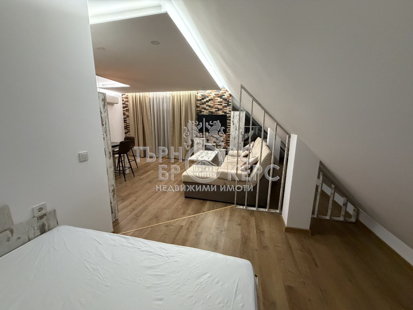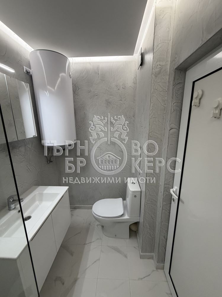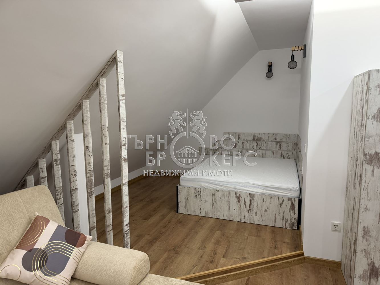 Екипът на Търново Брокерс Ви представя едностаен апартамент, находящ се в кв.Бузлуджа. Жилището е със следното разпределение: Всекидневна с кухненски бокс, отделен кът за спалня, баня и тоалетна, коридор и 14кв.м. тераса, която е покрита и разполага с хидромасажна вана с топла вода. Изцяло обзаведено и оборудвано със следните ел.уреди: вградена фурна с котлони, пералня, сушилня, хладилник, телевизор и климатик. Има възможност за наемане на надземно паркомясто.