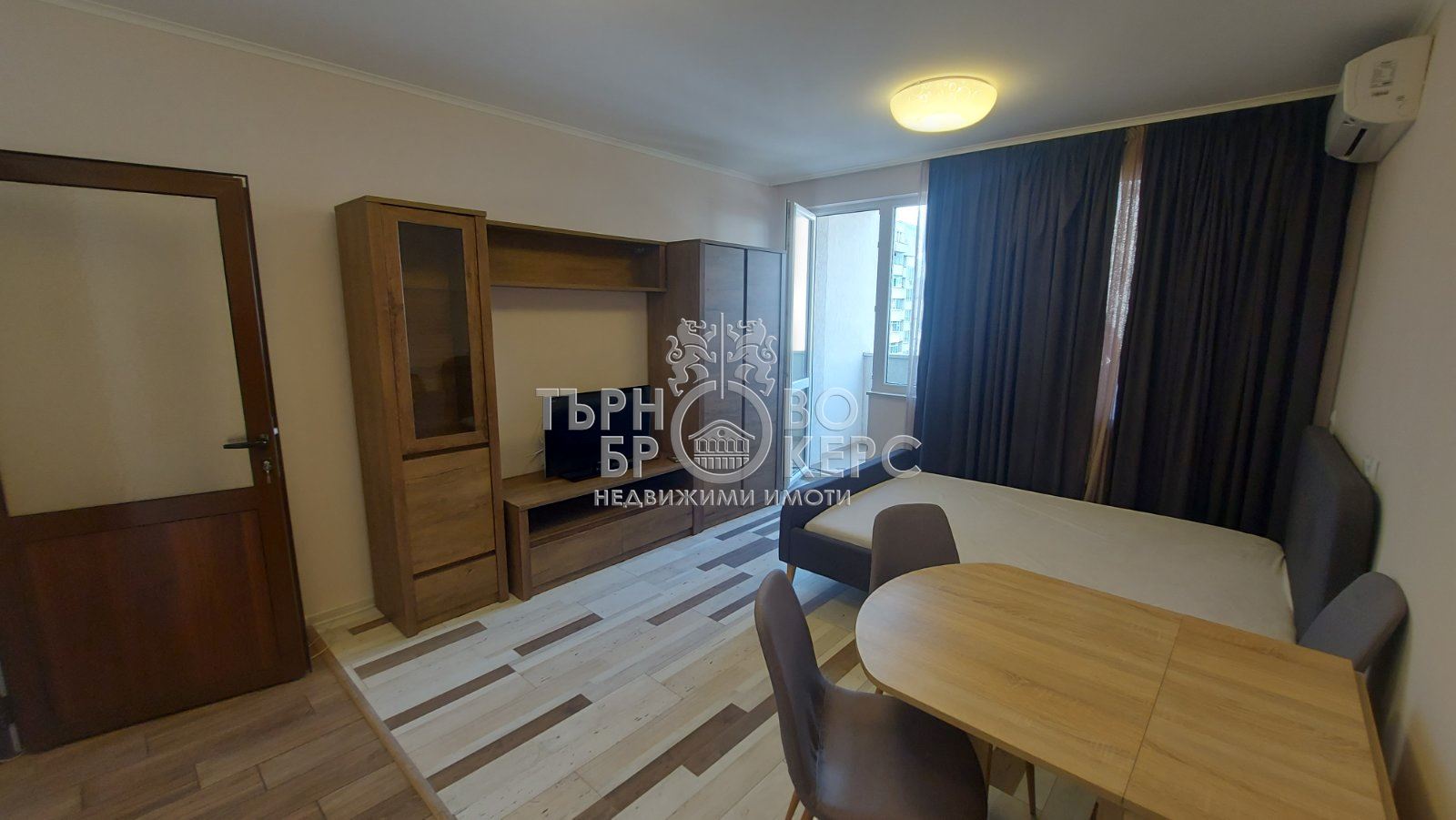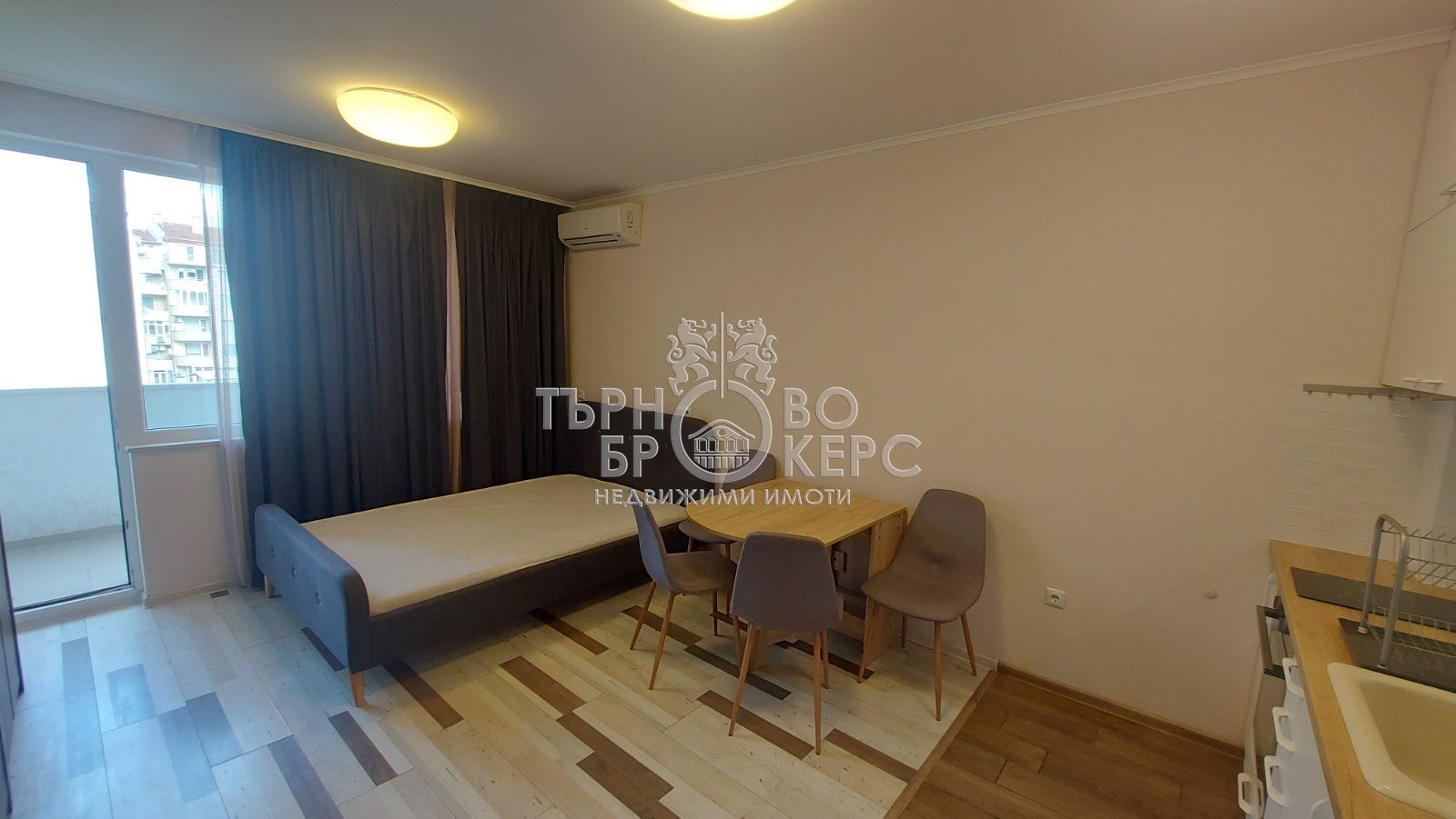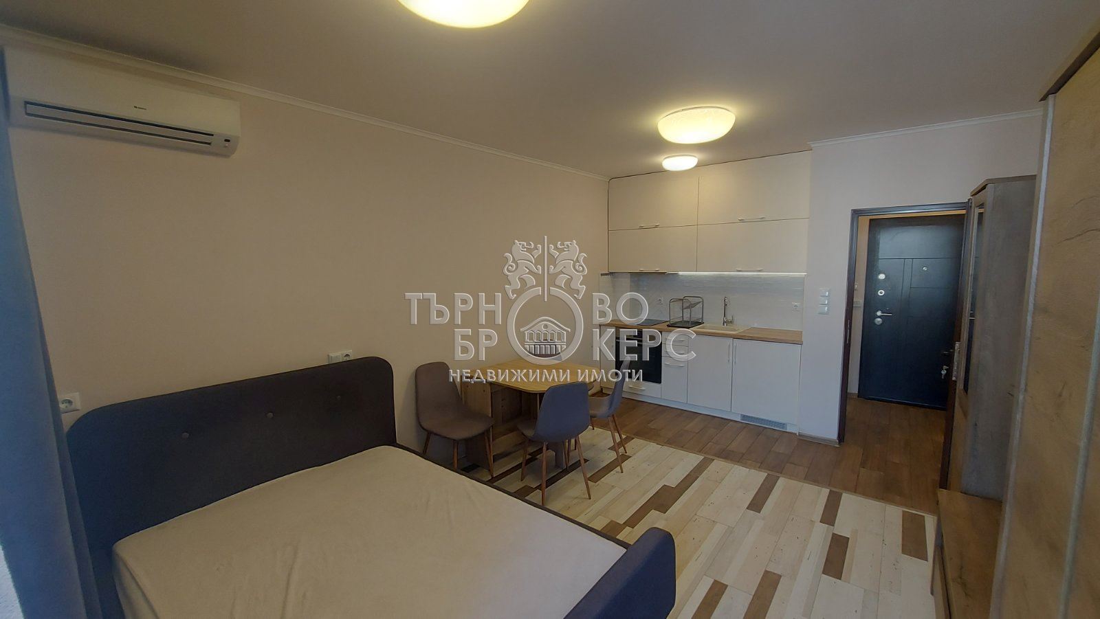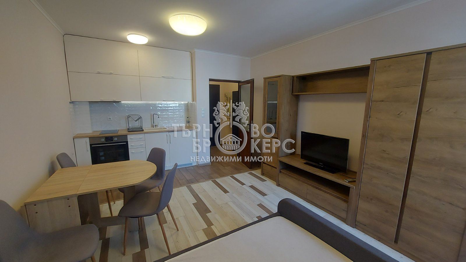 Екипът на Търново Брокерс Ви представя боксониера ново строителство, находяща се в кв.Колю Фичето. Имотът се състои от входно антре, стая с кухненски бокс и кът за спане, баня с тоалетна и тераса. Апартаментът е изцяло обзаведен и оборудван със следните ел.уреди: вградена фурна с котлони, аспиратор, пералня, хладилник, климатик и телевизор.