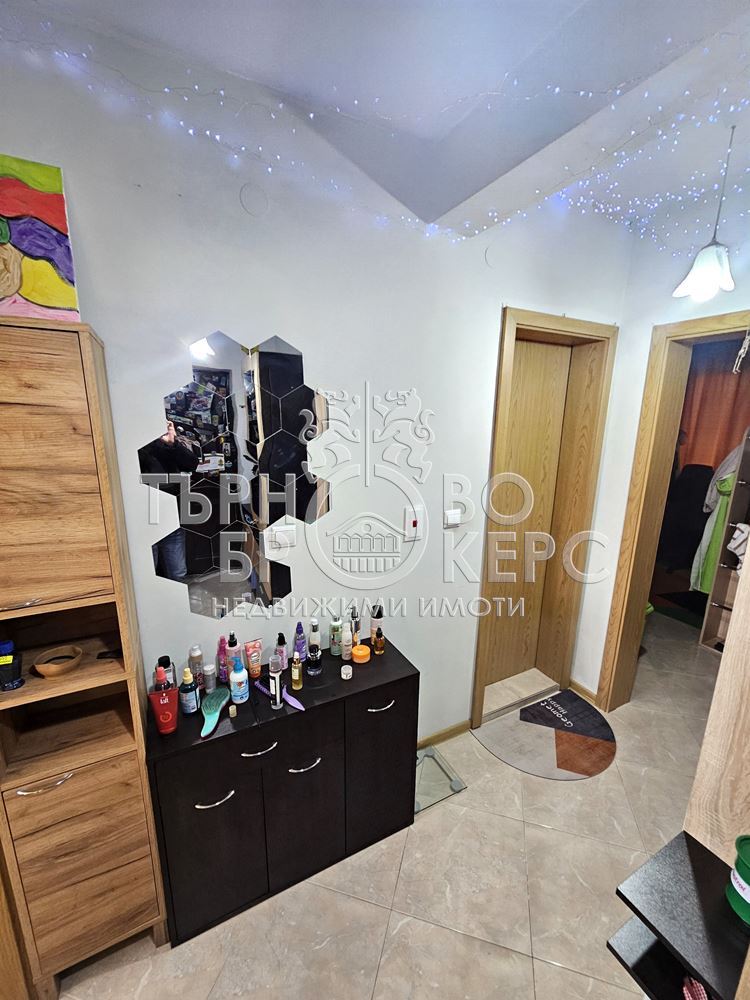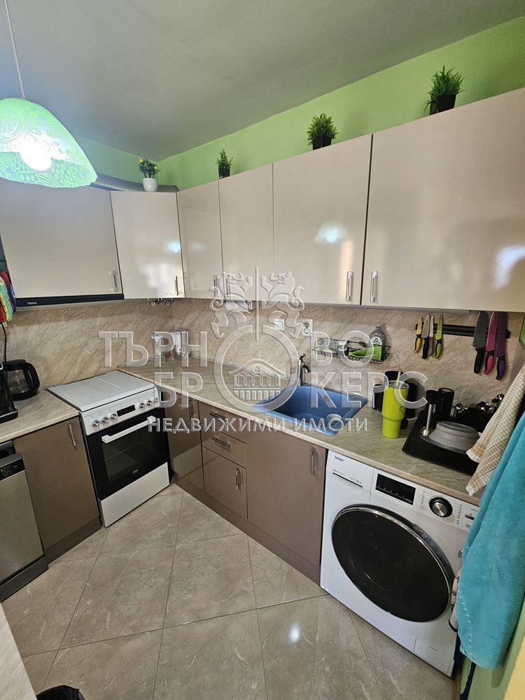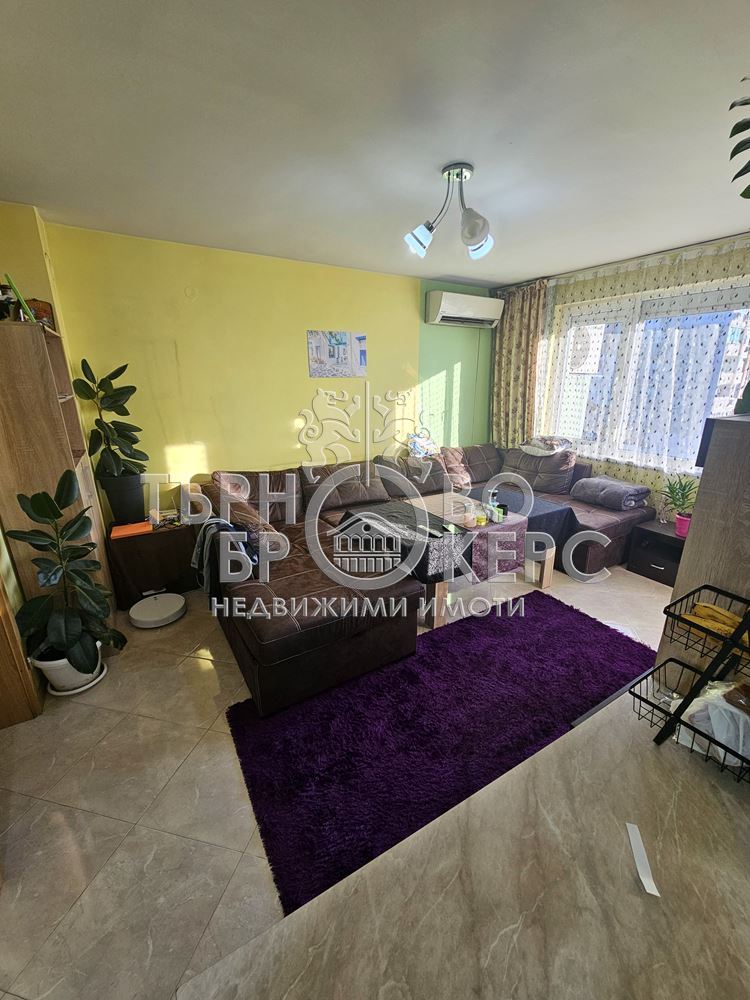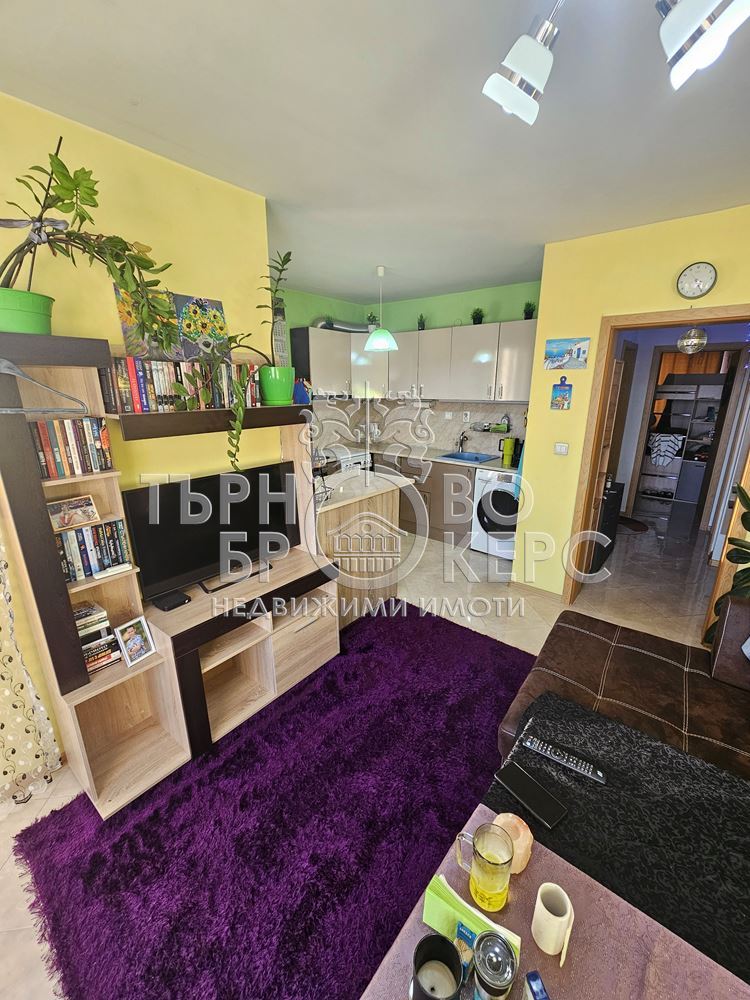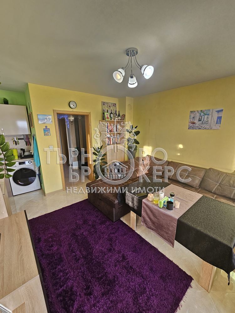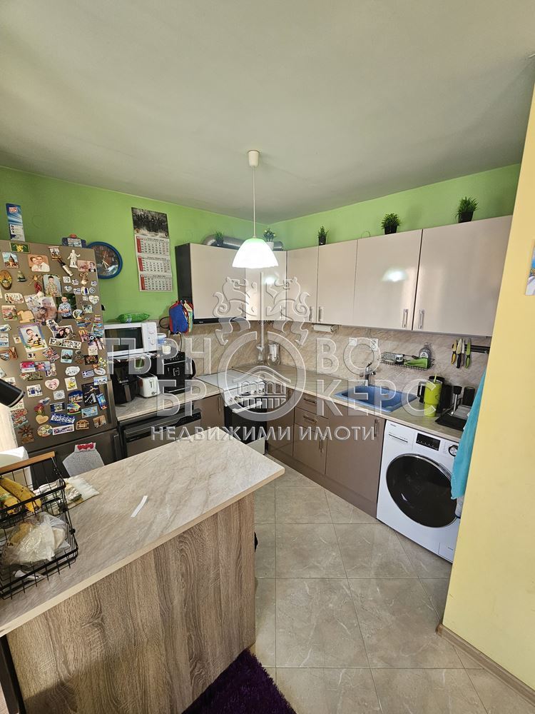 Функционален тристаен апартамент с панорамна гледка в кв. Кольо Фичето, Велико ТърновоПредлагаме Ви функционален и напълно обзаведен тристаен апартамент, разположен в един от най-предпочитаните квартали на Велико Търново – кв. Кольо Фичето.Имотът е с обща площ от 90 кв.м., от които 78 кв.м. чиста жилищна площ, 2 кв.м. избено помещение и 10 кв.м. общи части. Намира се на седми(последен) етаж в тухлена сграда ново строителство с АКТ 16 от 2011 г., с поддържани общи части и отлична локация.Разпределение:*Просторна всекидневна с кухненски бокс*Две самостоятелни спални*Коридор*Баня с тоалетна*Две остъклени терасиАпартаментът е с юг-север изложение, което осигурява естествена светлина през целия ден и добра вентилация. От имота се разкрива приятна панорамна гледка.Жилището се продава напълно обзаведено и оборудвано, което го прави готово за нанасяне без допълнителни инвестиции.Имотът е отличен избор за семейство, търсещо комфорт, функционалност и спокойна жилищна среда в развит район с всички необходими удобства в близост – магазини, училища, детски градини, спирки и паркови пространства.